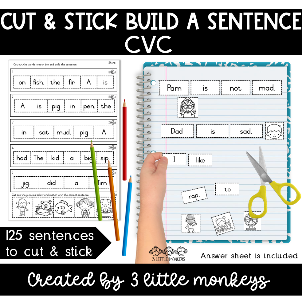 Build confident early readers with this engaging CVC Cut & Stick Sentence Building pack! Learners cut, arrange, and stick jumbled CVC words to form simple sentences, then match each sentence to the correct picture.