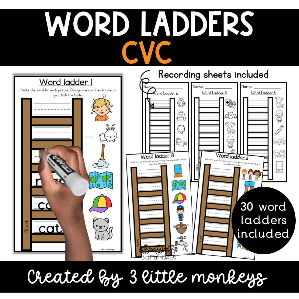 The pack includes 30 word ladders in a colour version for centres (ideal for laminating and reusing with whiteboard markers), black and white recording sheets for written practice or assessment, and an answer sheet for easy self-checking.