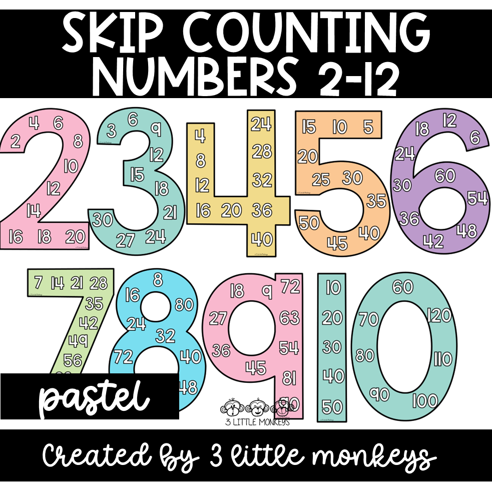 This resource includes large, pastel-coloured numbers to support skip counting from 2 to 12. Each number is filled with the correct skip-counting sequence, making it an ideal visual reference for young learners.